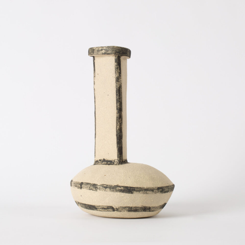 “I am attracted by the simple continuous patterns as you can see with my brand name dots and lines 10 to 1000. I predominantly use underglaze and oxides for my designs with multiple techniques such as sgraffito, wax resist, use masking tape, paper transfers on leather hard, bone dry or bisque wares before the glaze firing. Drawing with underglaze pencils and crayons on the bisque ware adds more layers to my finished products. I can not resist applying something if there is a white canvas there. Another preferred method of slab inlay is the use of multiple clay bodies into one another for graphical surface decoration. You get interesting patterns and textures on your pieces. I focus on the balance as it is important in anything. I picture rough images of the desired piece first but sometimes it ends up completely different from what I have imagined. I then let it be and follow what my hands wants to make. I’m always happy to follow plan B. I want my pieces to be visually captivating and also functional. I also keep in mind that the pieces have multiple characters with any angle you look at it. I like making my pieces that can’t be replicated. That theory keeps me busy to make new lines and that way I could learn more and discover a new me”.
