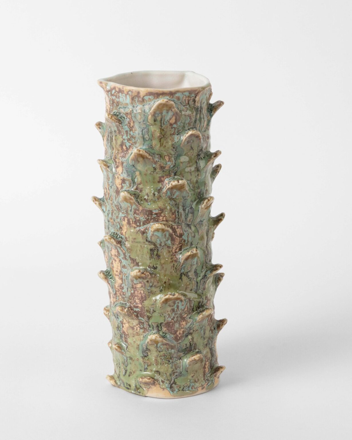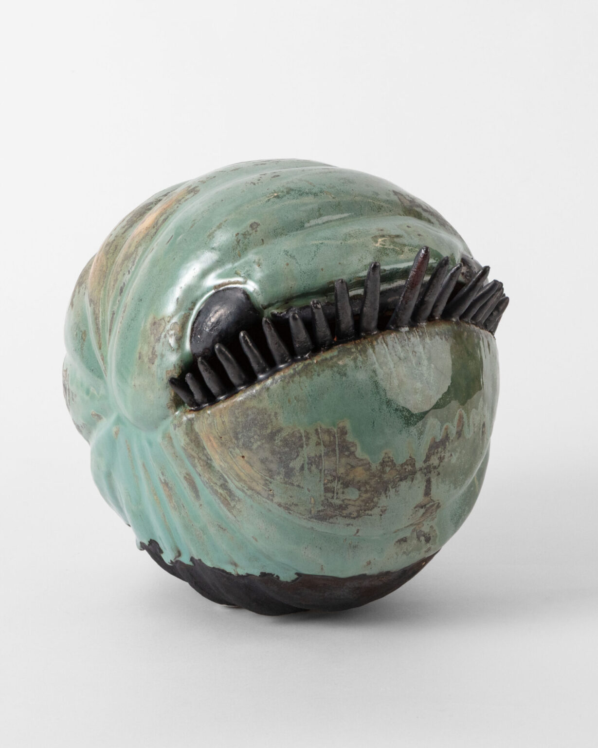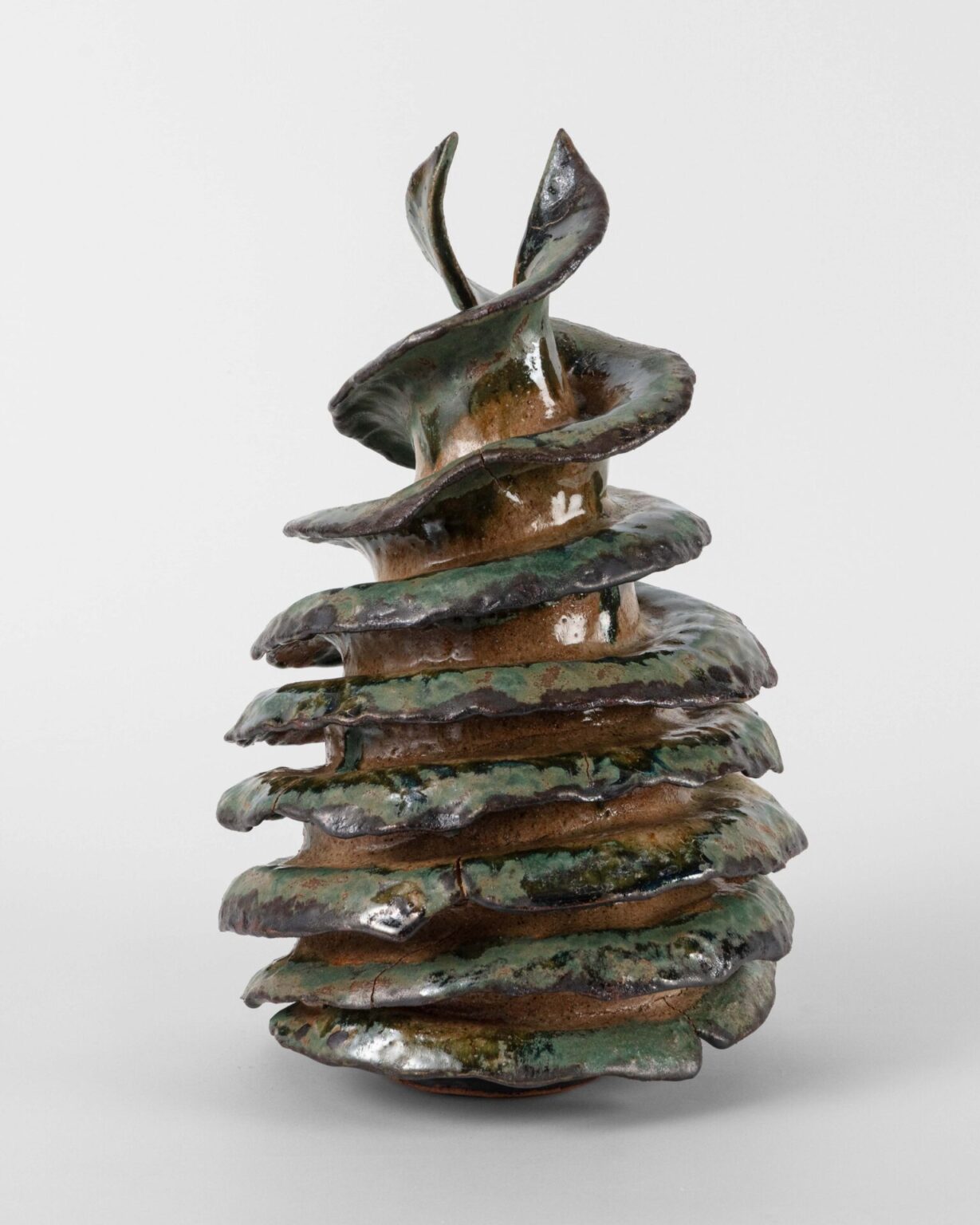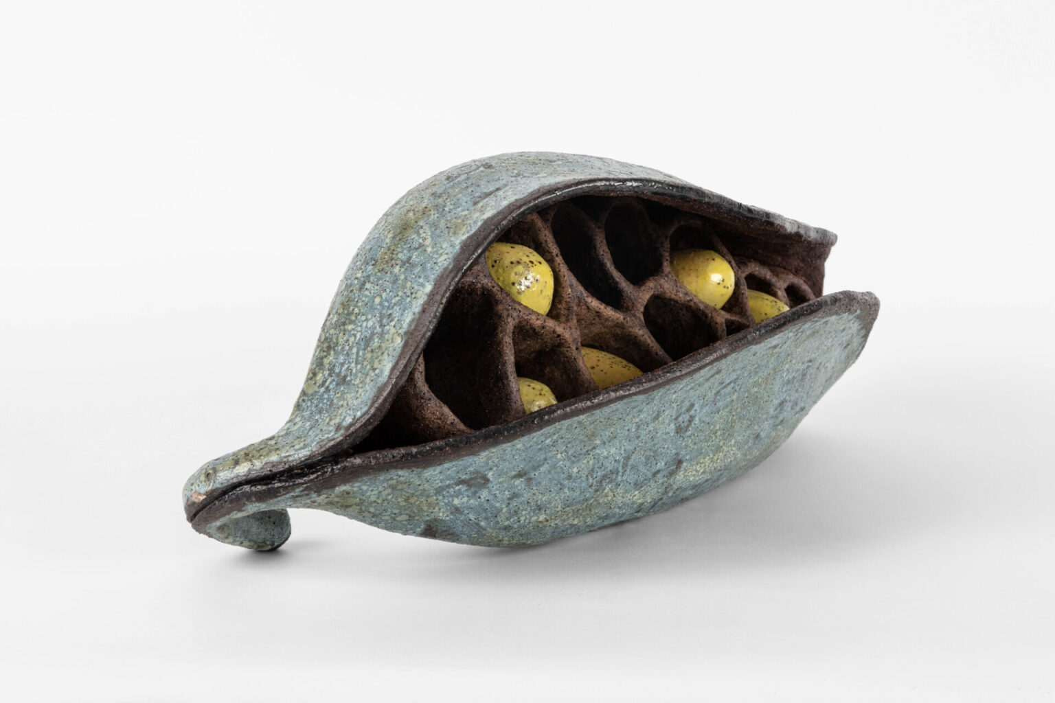 “Pulse is a collection that explores interspecies communication,” says the artist, who sculpts her scrolling, spiralling forms, fossil-like seedpods and totemic insect deities on a scale that conveys primordial heft and monumentality, albeit tempered by the weathered surfaces and nuanced effects wrought by the firing process.